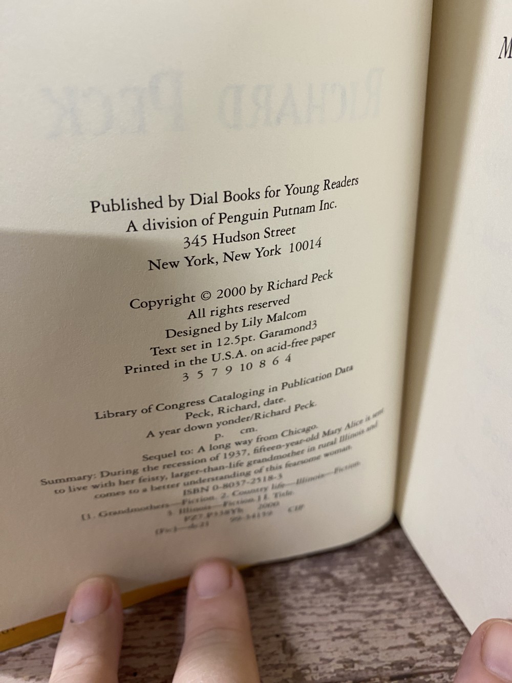 A Year Down Yonder by Richard Peck. Newbery Medal winner, HC w DJ, second printing, 2000