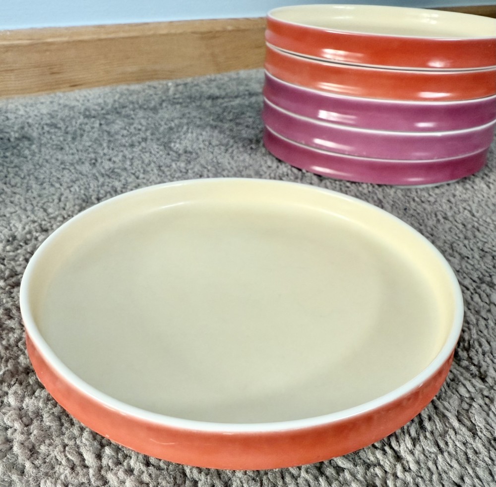 Vintage set of 6 Block Chromatics ceramic mauve/peach colored stackable plates.