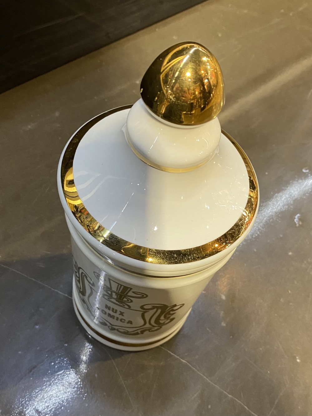 “Nux Vomica” ceramic apothecary jar.White with metallic gold decoration.marked “Owens Illinois”
