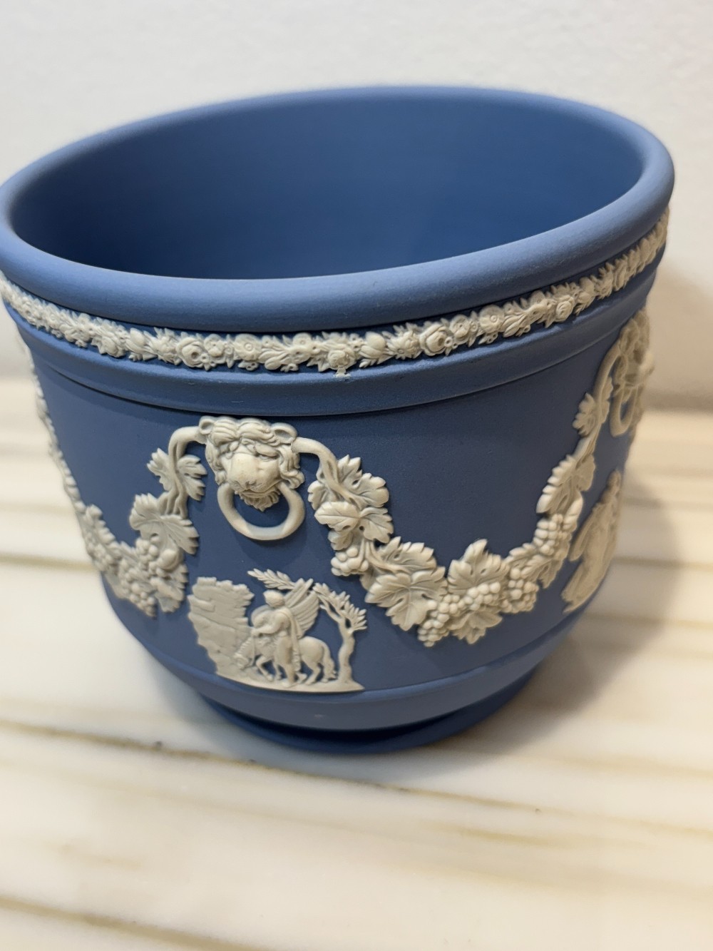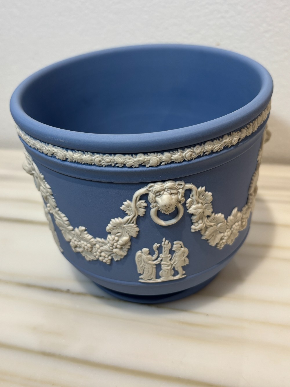 Excellent detail on this beautiful English Wedgewood planter. Blue Jasperware with white detailed decorations including lions heads and garlands.