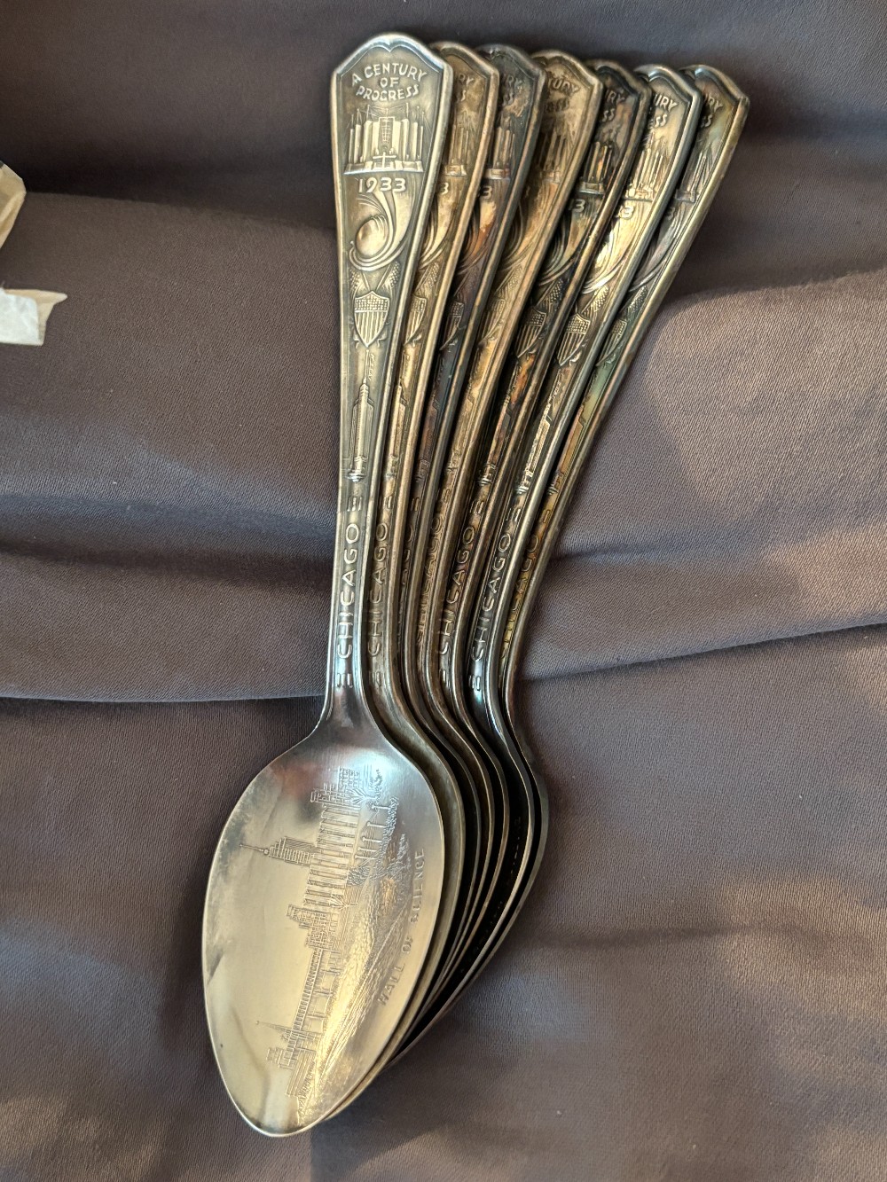 1933 Century of Progress Souvenir Spoons. Set of 7 with tissue and Box. Oneida Silverplate. Tissue paper is in poor condition as expected with age. 4 pieces of tissue. Oneida 25-yr guarantee is printed on the tissue.