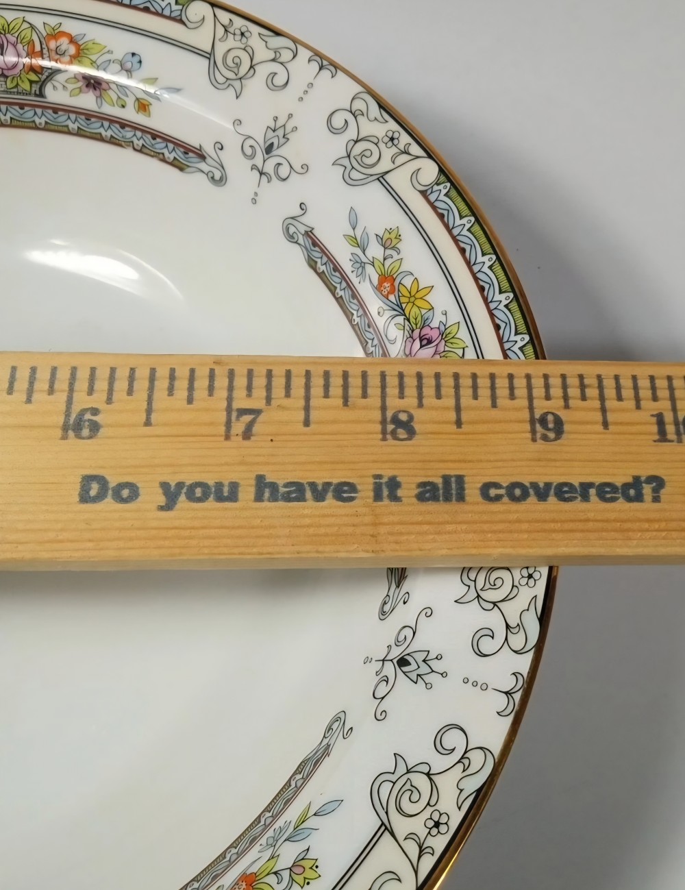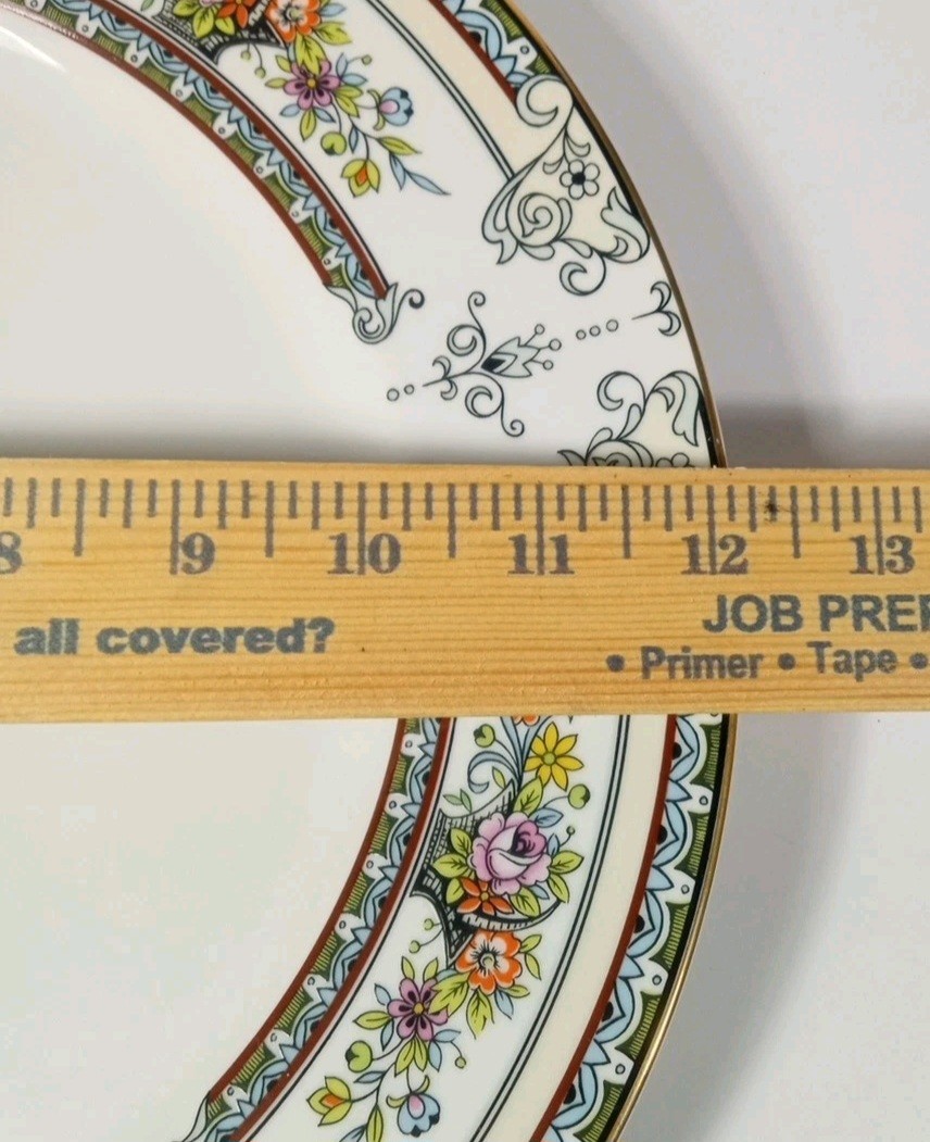 The design, which features floral baskets and scrolls with a multicolored band of greens, blues, and other hues, along with gold-toned trim, is sure to embellish your table setting on any special occasion. The vintage yet modern design will be a focal point of conversation. In contemporary times, pieces like this are essential for evoking cherished memories and initiating engaging discussions.