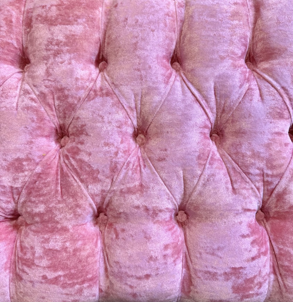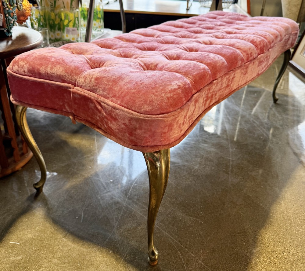 Vintage long pink velvet tufted bench w/ metal legs. 48 x 18 x 17 in