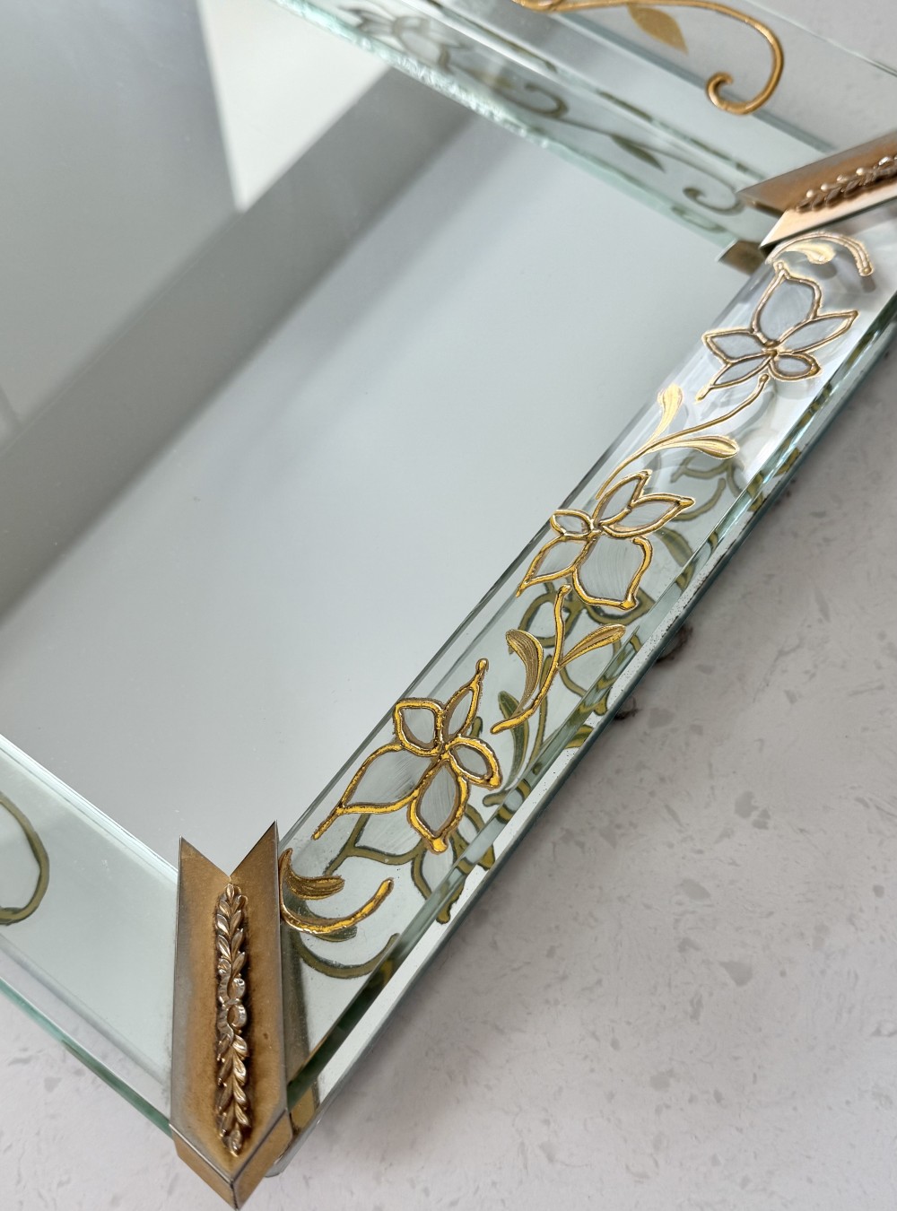 Vintage long rectangular vanity glass mirror tray w/ gold flower details.