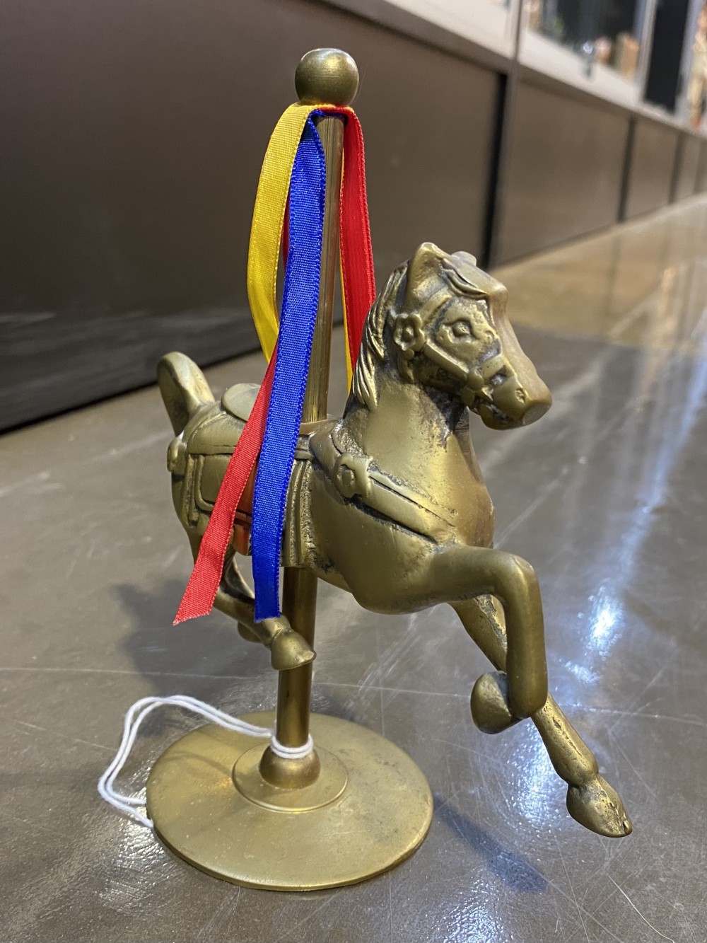 Vintage Brass Carousel Horse Figurine with colorful fabric ribbons