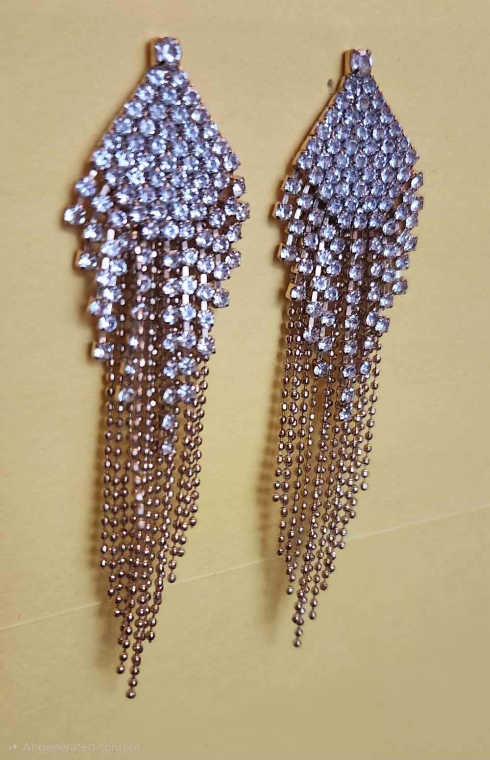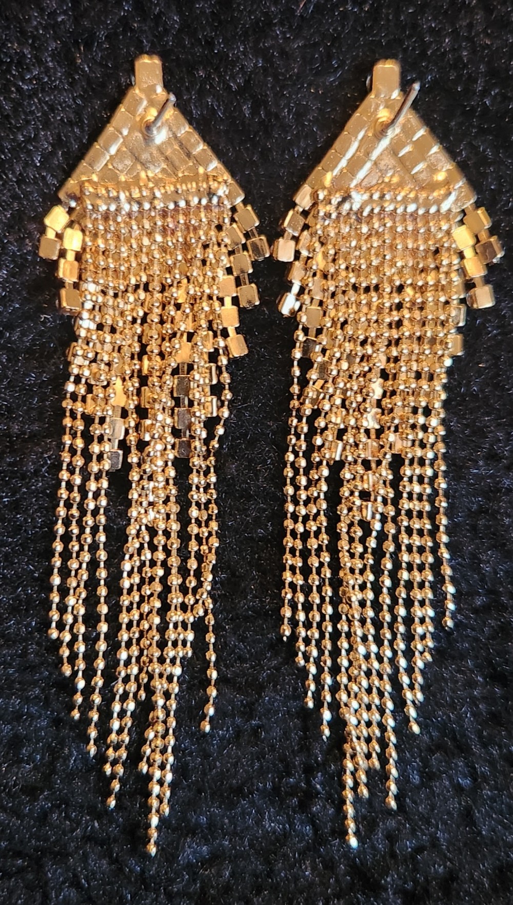 These pair of vintage 1990s long rhinestone chandelier fringe goldtone earrings feature a clustered rhinestone top section, from which multiple delicate metal chains elegantly cascade, creating a shimmering waterfall or duster effect.