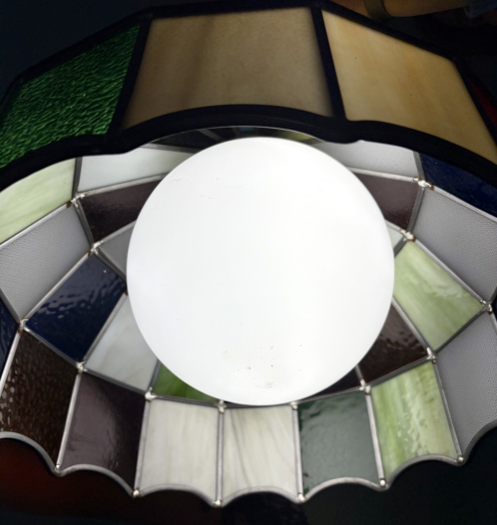 Vintage large Tiffany style multicolored stained glass bar/kitchen/rec room swag lamp. Works!