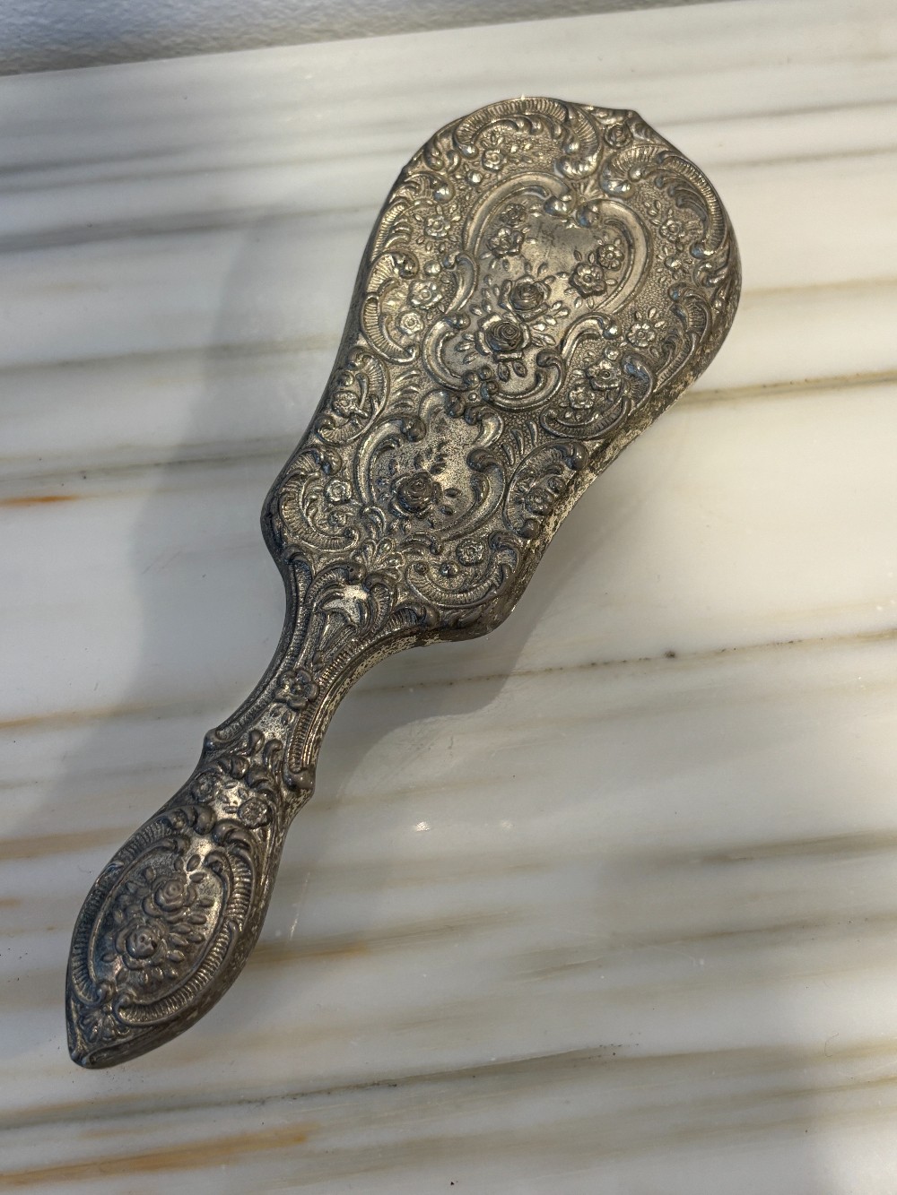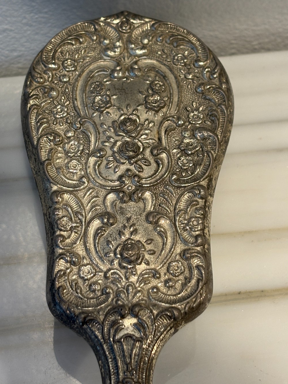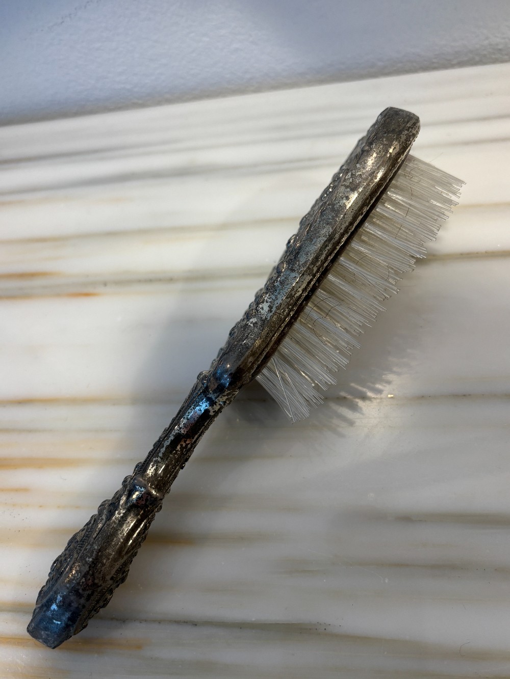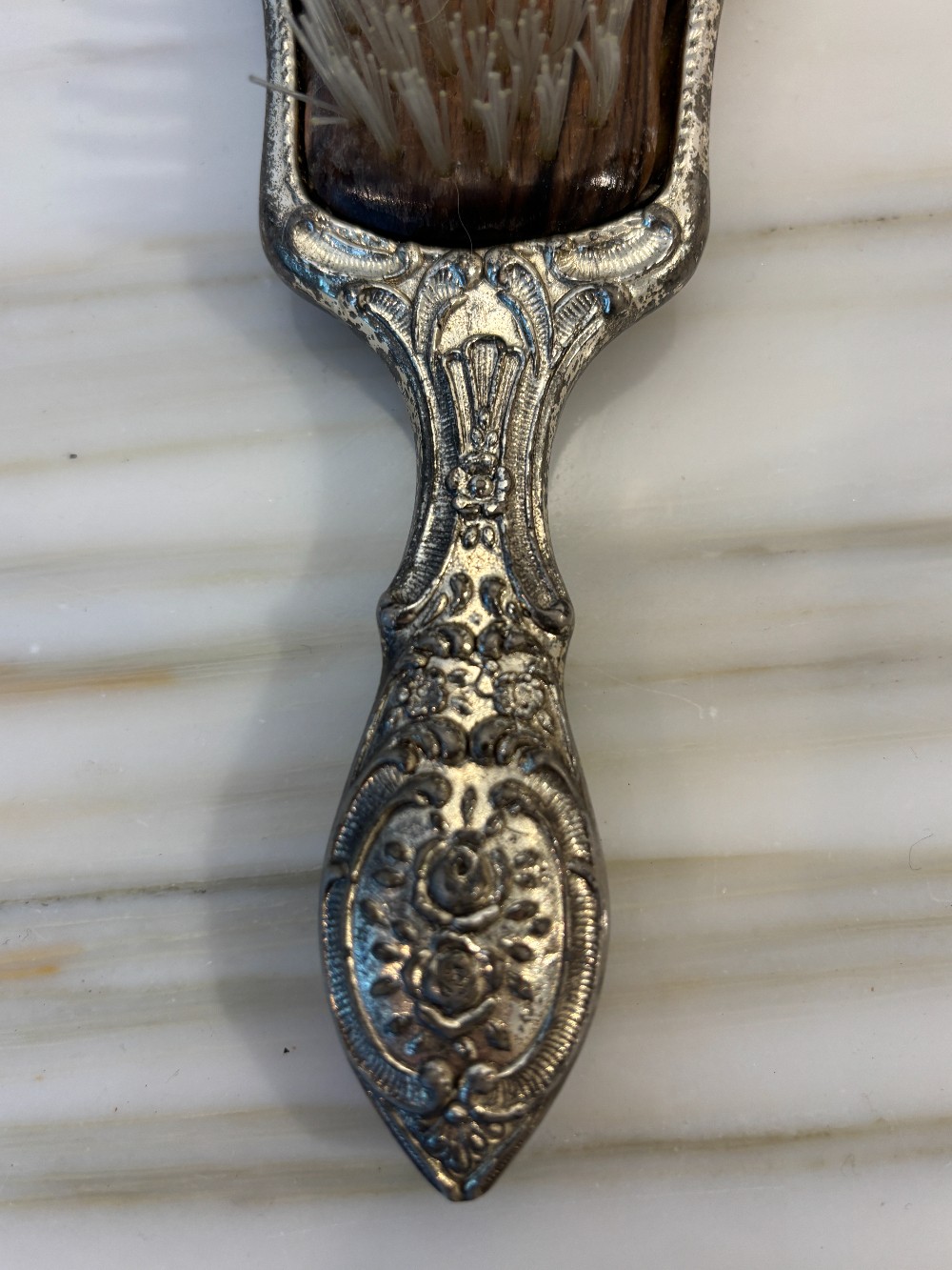 Ornate Silverplate Brush with nylon bristles and wood base.