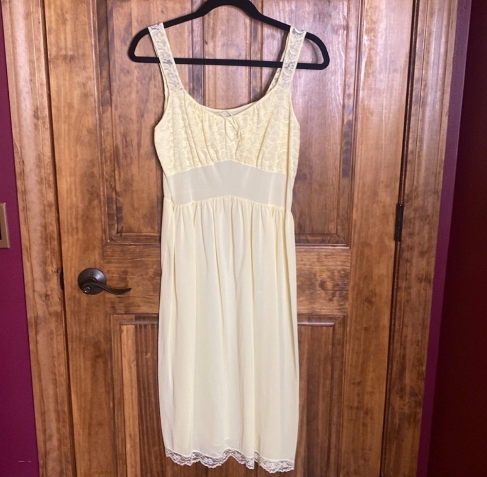 Sheer nylon chiffon robe with lace yoke + matching empire waist nightgown. Soft romantic bridal energy. Sz S/M.